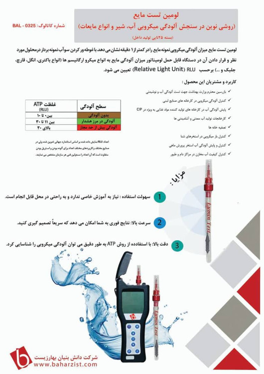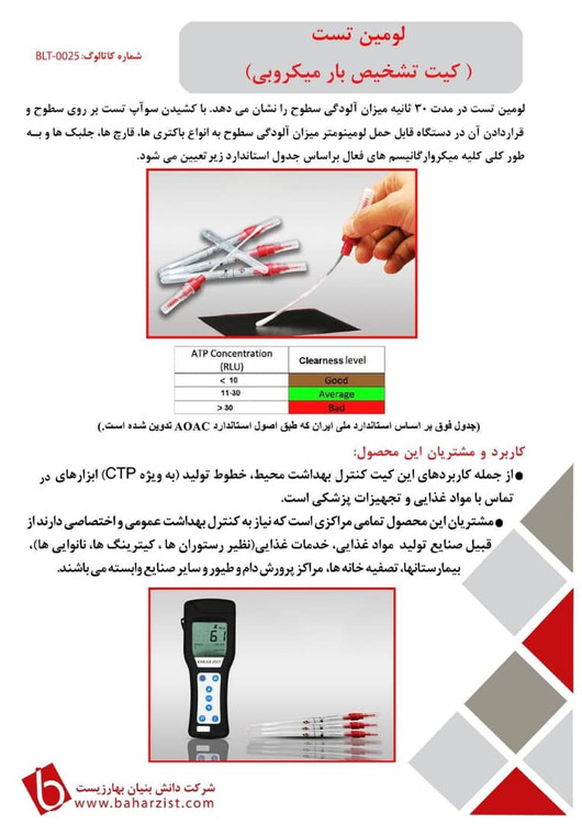 لومین تست در مدت 20 ثانیه میزان آلودگی سطوح را نشان میدهد. با کشیدن سوآپ تست بر روی سطوح و قرار دادن آن در دستگاه پایش لومینومتر میزان آلودگی سطوح به انواع باکتری ها ، قارچ ها ، جلبک ها و بطور کلی کلیه میکروارگانیسم های فعال بر اساس جدول استاندارد تعیین میشود